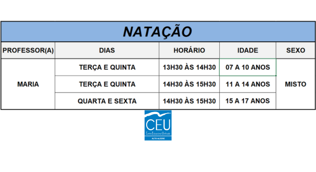 O CEU Alto Alegre conta com uma piscina semiolímpica e oferece três turmas de Natação.