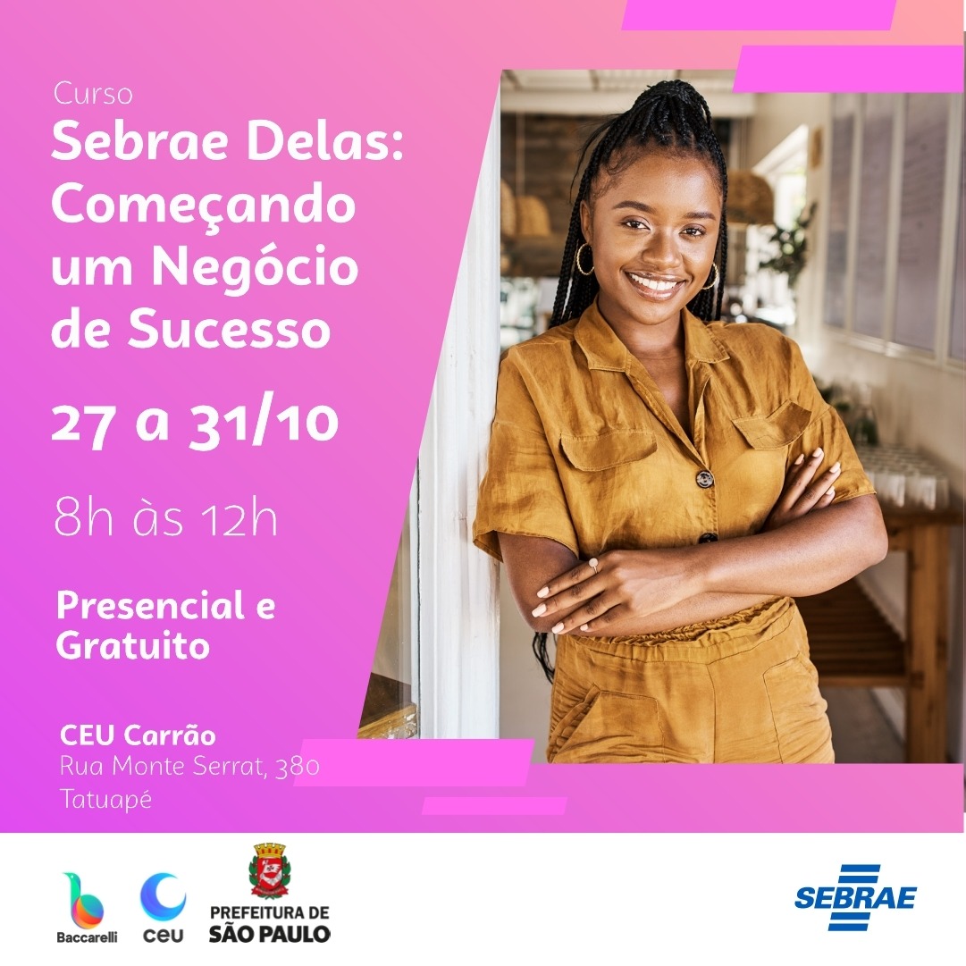 O CEU Carrão e o SEBRAE (em parceria com a Prefeitura de São Paulo e o Baccarelli) trazem para você o curso: Curso Sebrae Delas: Começando um Negócio de Sucesso |