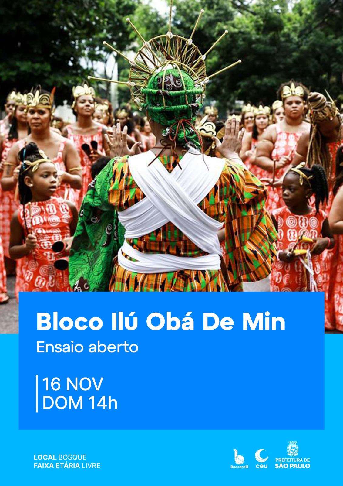 É com grande alegria que convidamos todas e todos para participar do ensaio aberto do Bloco Ilú Obá De Min, um momento de celebração, ancestralidade e valorização da cultura afro-brasileira.