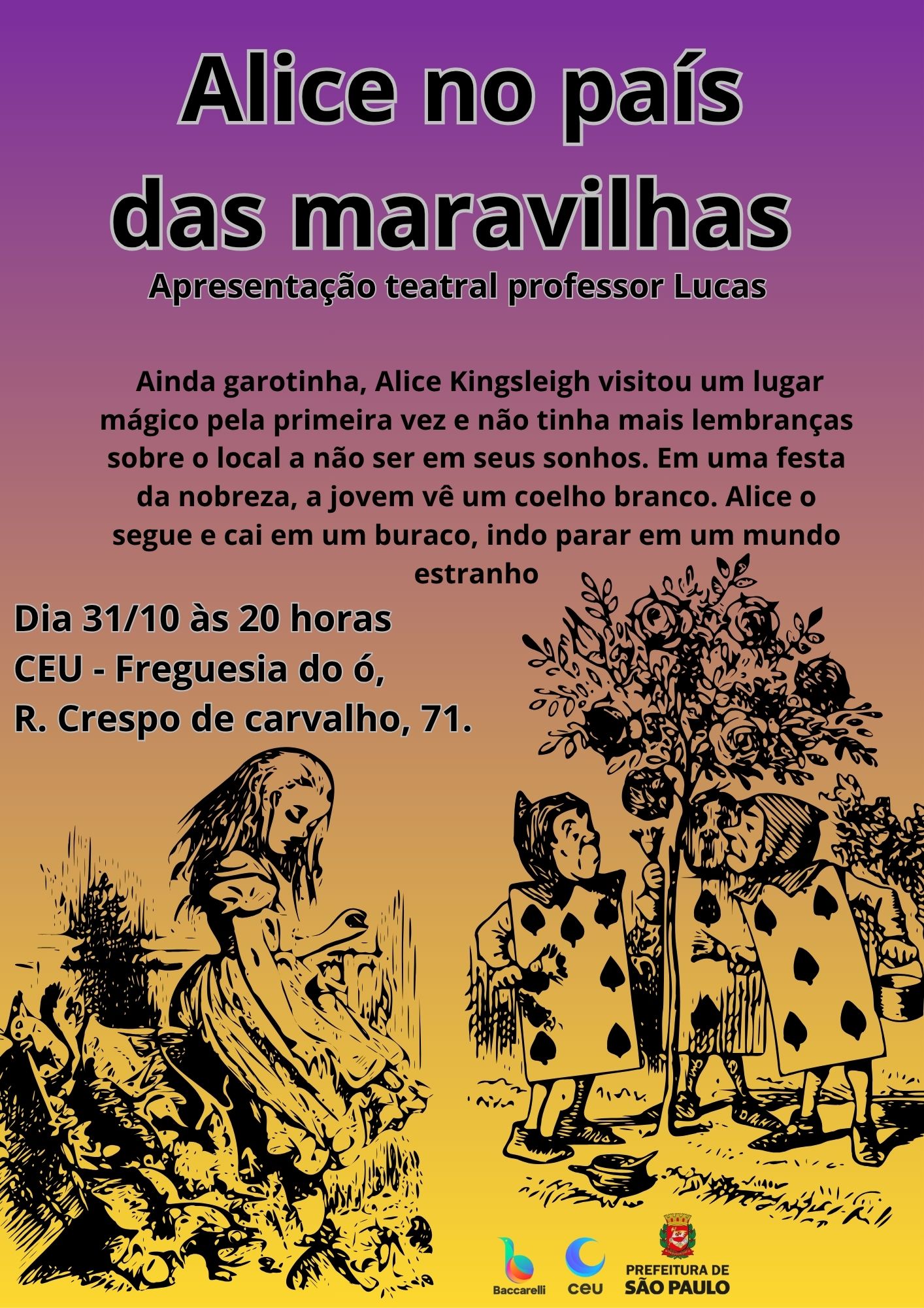 Sinopse: Ainda garotinha, Alice Kingsleigh visitou um lugar mágico pela primeira vez e não tinha mais lembranças sobre o local a não ser em seus sonhos. Em uma festa da nobreza, a jovem vê um coelho branco. Alice o segue e cai em um buraco, indo parar em um mundo estranho: o País das Maravilhas. Lá, ela reencontra personagens que estavam guardados em sua memória através dos sonhos.
