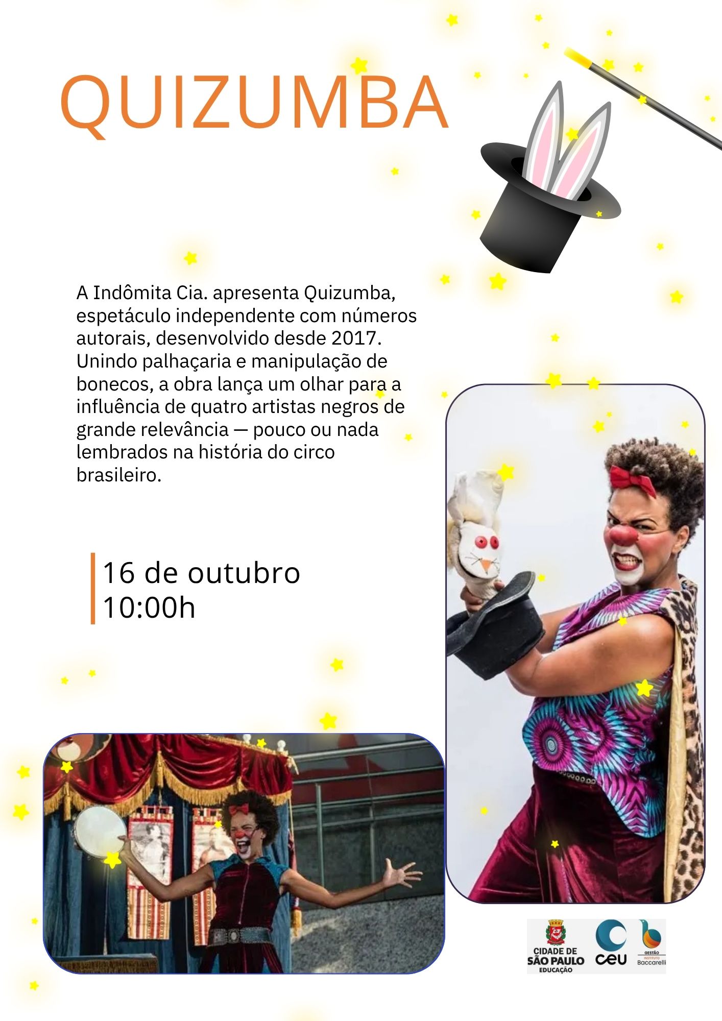 A Indômita Cia. apresenta Quizumba, espetáculo independente com números autorais, desenvolvido desde 2017. Unindo palhaçaria e manipulação de bonecos, a obra lança um olhar para a influência de quatro artistas negros de grande relevância — pouco ou nada lembrados na história do circo brasileiro. Ao homenageá-los e pedir licença a essas figuras fundamentais, o espetáculo também reafirma o trabalho autoral da artista em cena. Guiado pela ideia de que não existe fim, apenas “começo – meio – começo”, Quizumba convida os mais jovens a honrar os mais velhos e, de forma lúdica, divertida e poética, lembra que um povo que não conhece suas origens também não saberá para onde vai.