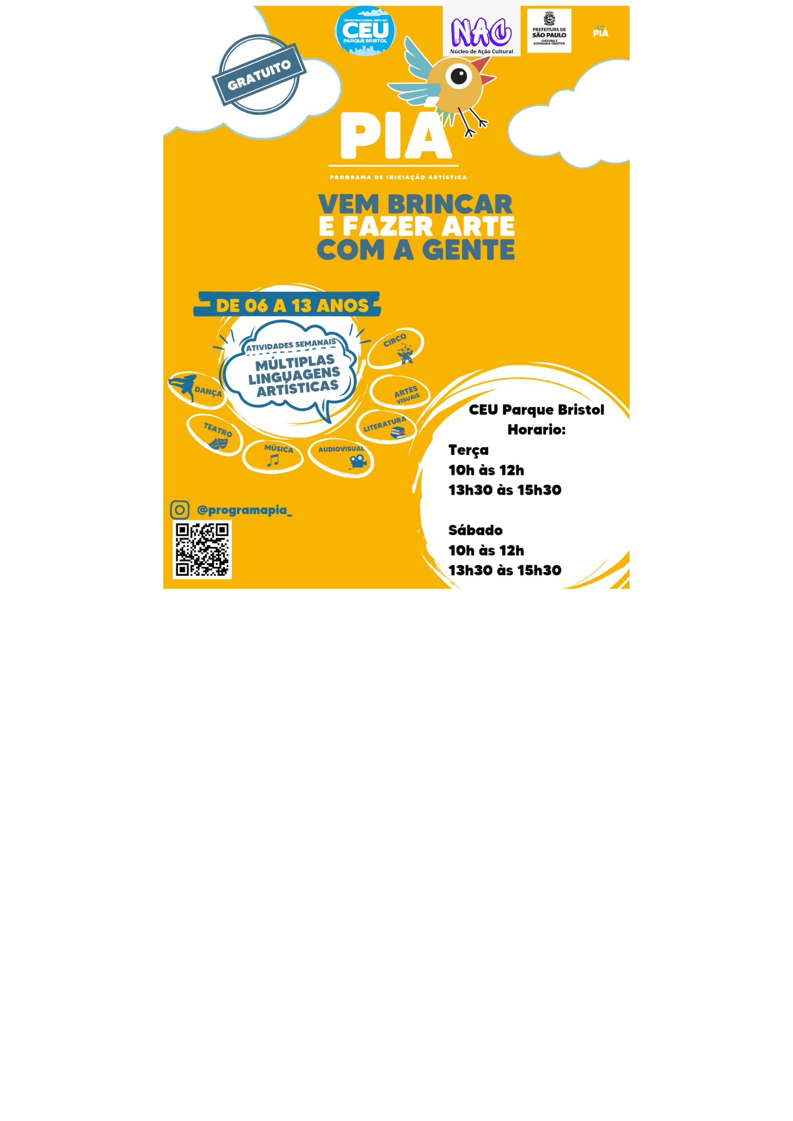 Inscrições no CEU Parque Bristol, (Gestão) de segunda a sábado das as 8h00 às 14h00.