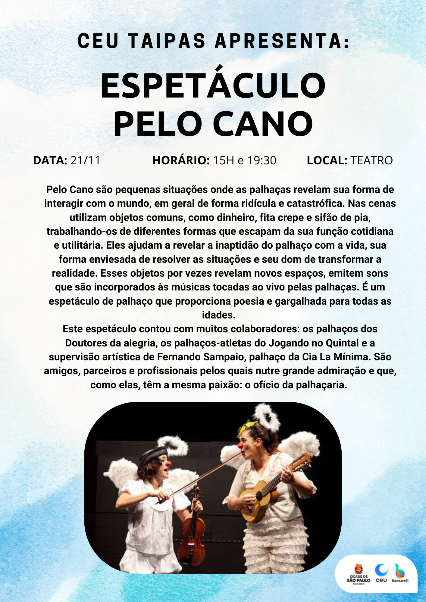 Pelo Cano são pequenas situações onde as palhaças revelam sua forma de interagir com o mundo, em geral de forma ridícula e catastrófica. Nas cenas utilizam objetos comuns, como dinheiro, fita crepe e sifão de pia, trabalhando-os de diferentes formas que escapam da sua função cotidiana e utilitária. Eles ajudam a revelar a inaptidão do palhaço com a vida, sua forma enviesada de resolver as situações e seu dom de transformar a realidade. Esses objetos por vezes revelam novos espaços, emitem sons que são incorporados às músicas tocadas ao vivo pelas palhaças. É um espetáculo de palhaço que proporciona poesia e gargalhada para todas as idades.