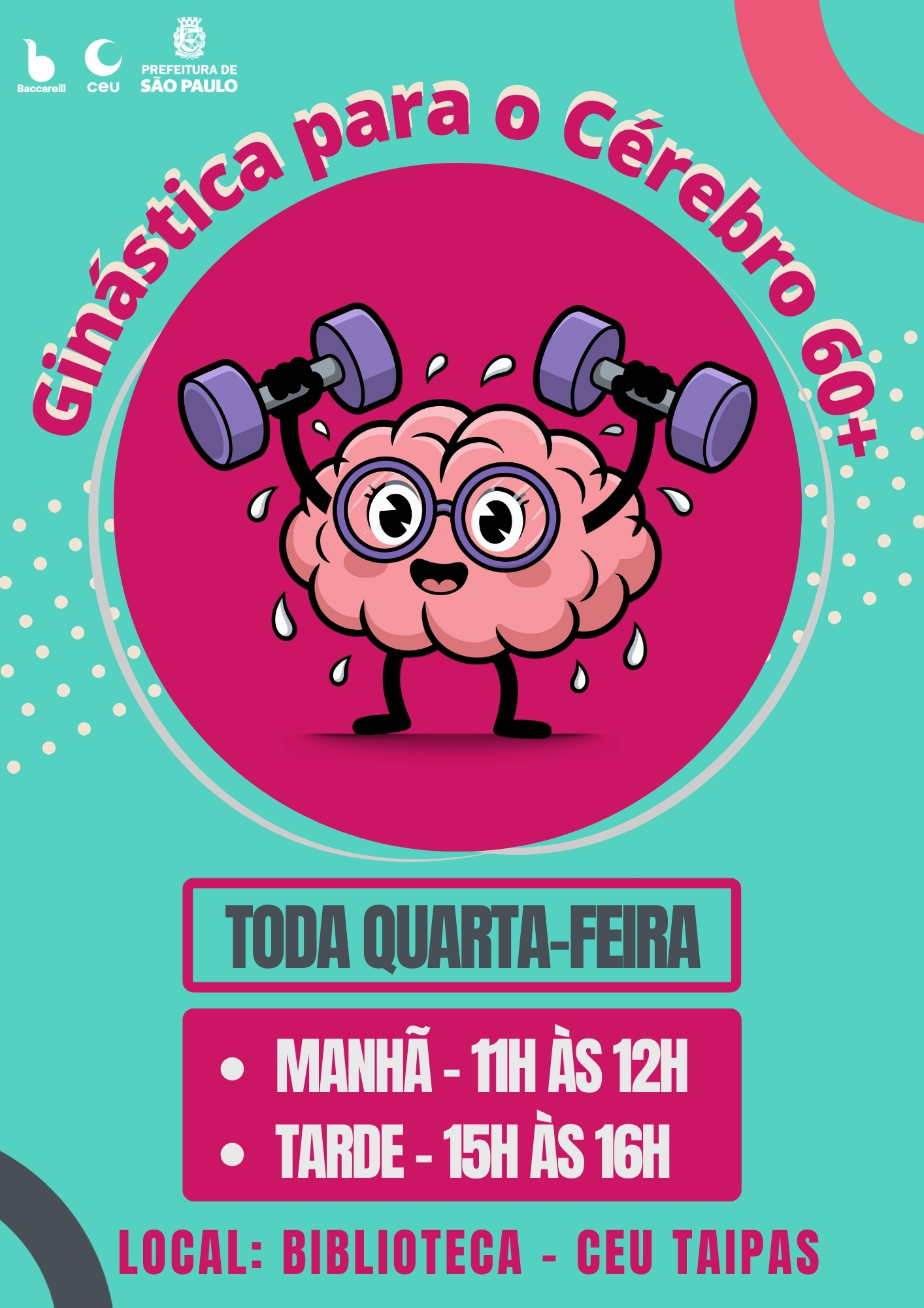 A atividade “Ginástica para o Cérebro 60+” oferece exercícios e dinâmicas que estimulam a memória, a atenção, o raciocínio e outras habilidades cognitivas, contribuindo para o bem-estar e a qualidade de vida do público idoso.