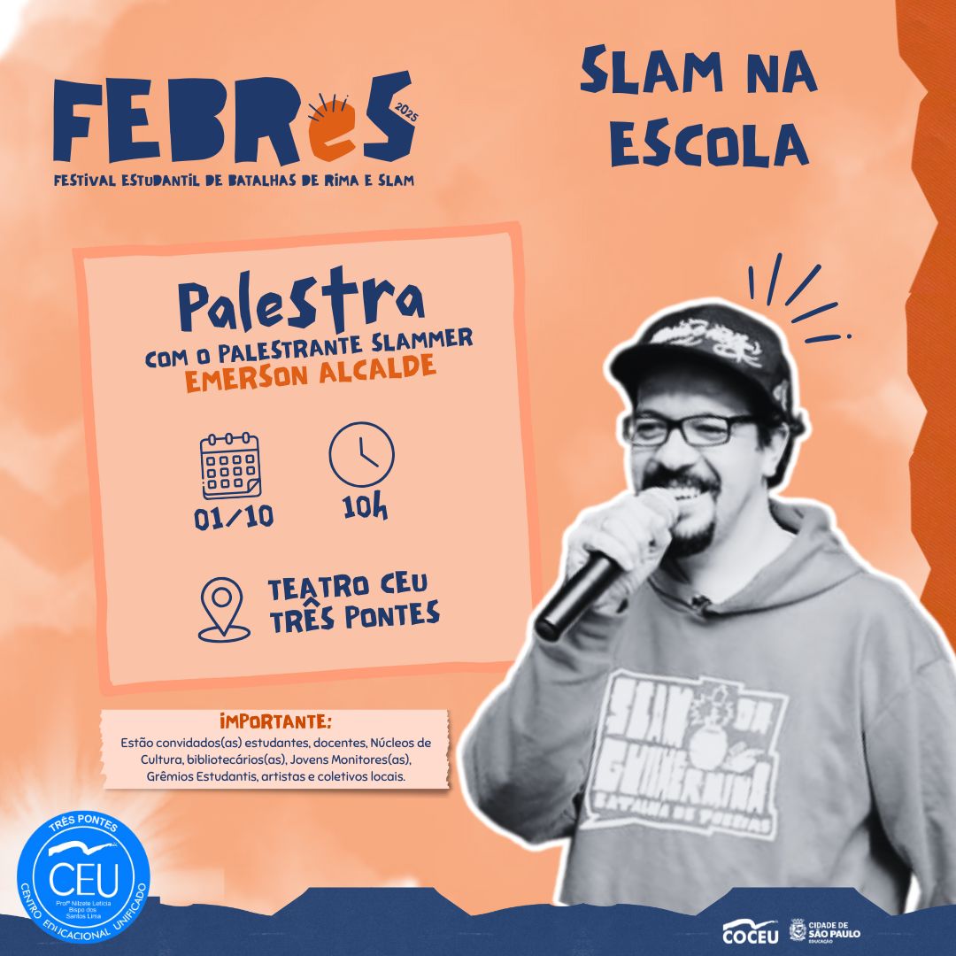 Nesta palestra, Alcalde traz a essência do Slam ao nosso território, estimulando a criação poética dos alunos e explorando essa forma de arte incrível, dando voz aos futuros autores e artistas.