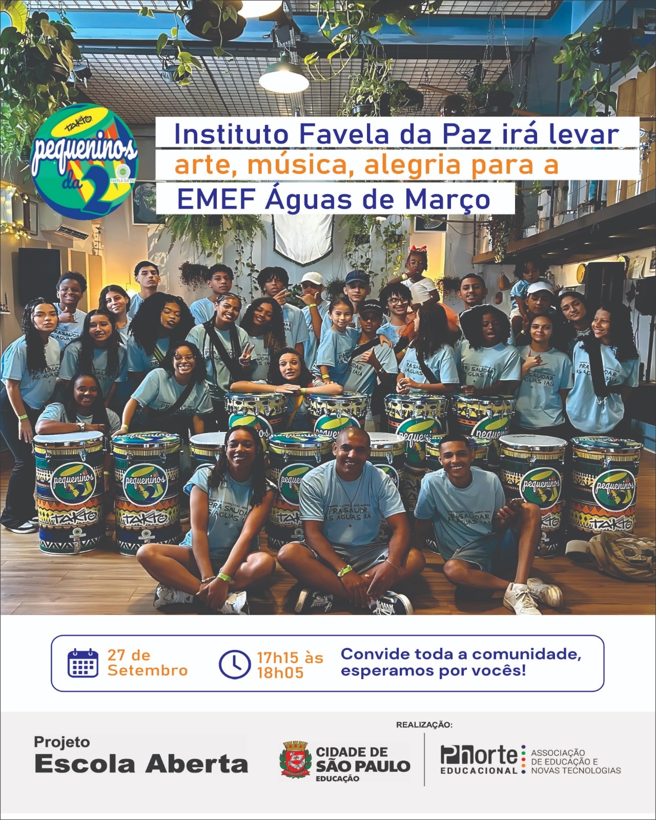 O show “Pequeninos da 2”, do Instituto Favela da Paz, integrará a programação do evento bimestral do programa Escola Aberta. A apresentação de percussão musical, com aproximadamente 50 minutos de duração, é protagonizada pelas crianças, adolescentes e jovens que participam do projeto.