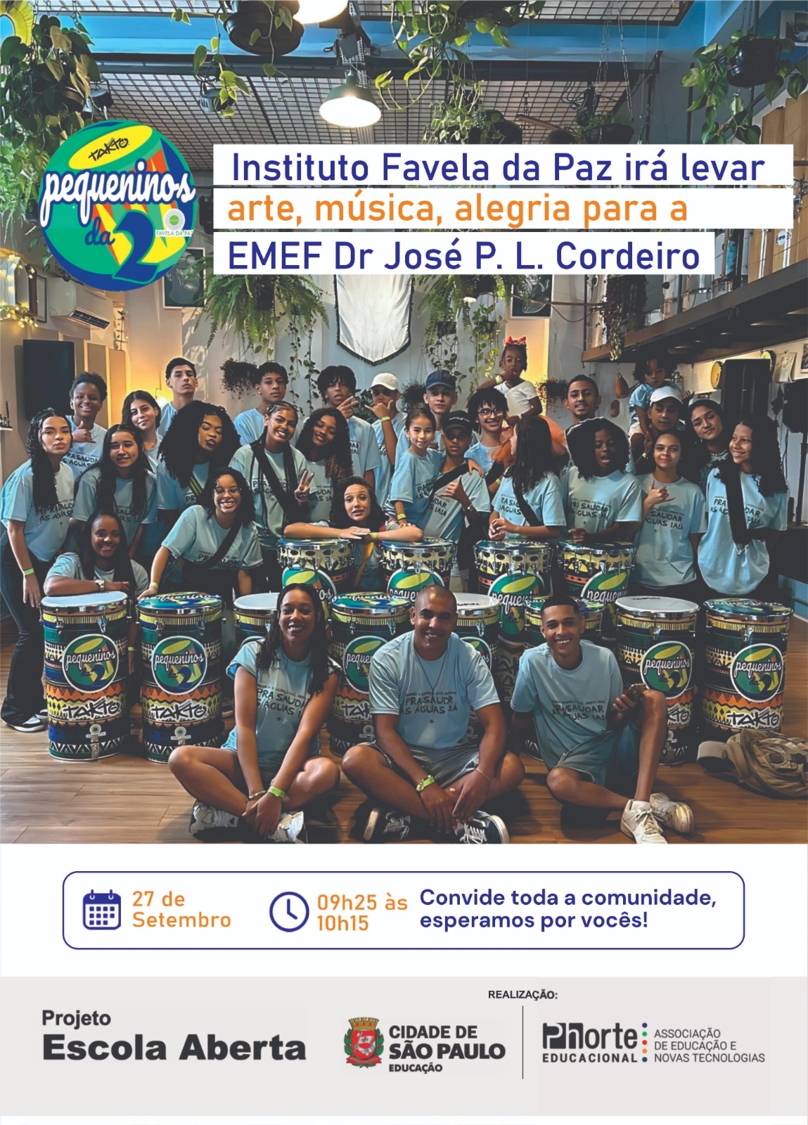 O show “Pequeninos da 2”, do Instituto Favela da Paz, integrará a programação do evento bimestral do programa Escola Aberta. A apresentação de percussão musical, com aproximadamente 50 minutos de duração, é protagonizada pelas crianças, adolescentes e jovens que participam do projeto.