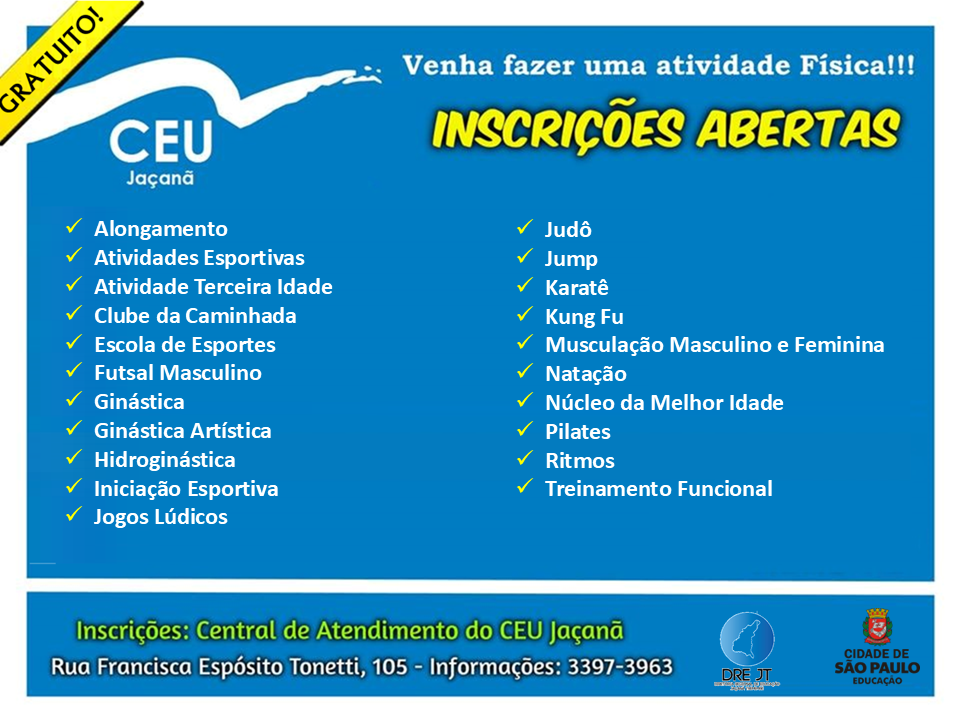 Para participar e necessário fazer a carteirinha do CEU e verificar a disponibilidade de horário e a faixa etária, as vagas são limitadas!